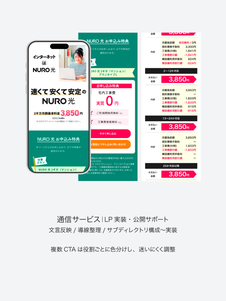LPは、見た目がきれいなだけでは成果につながりません。誰に向けてどの順番で伝え、どこで不安を解消し、行動してもらうのか。構成/訴求/導線まで含めて設計し、行動につながるLPをご提案しています。